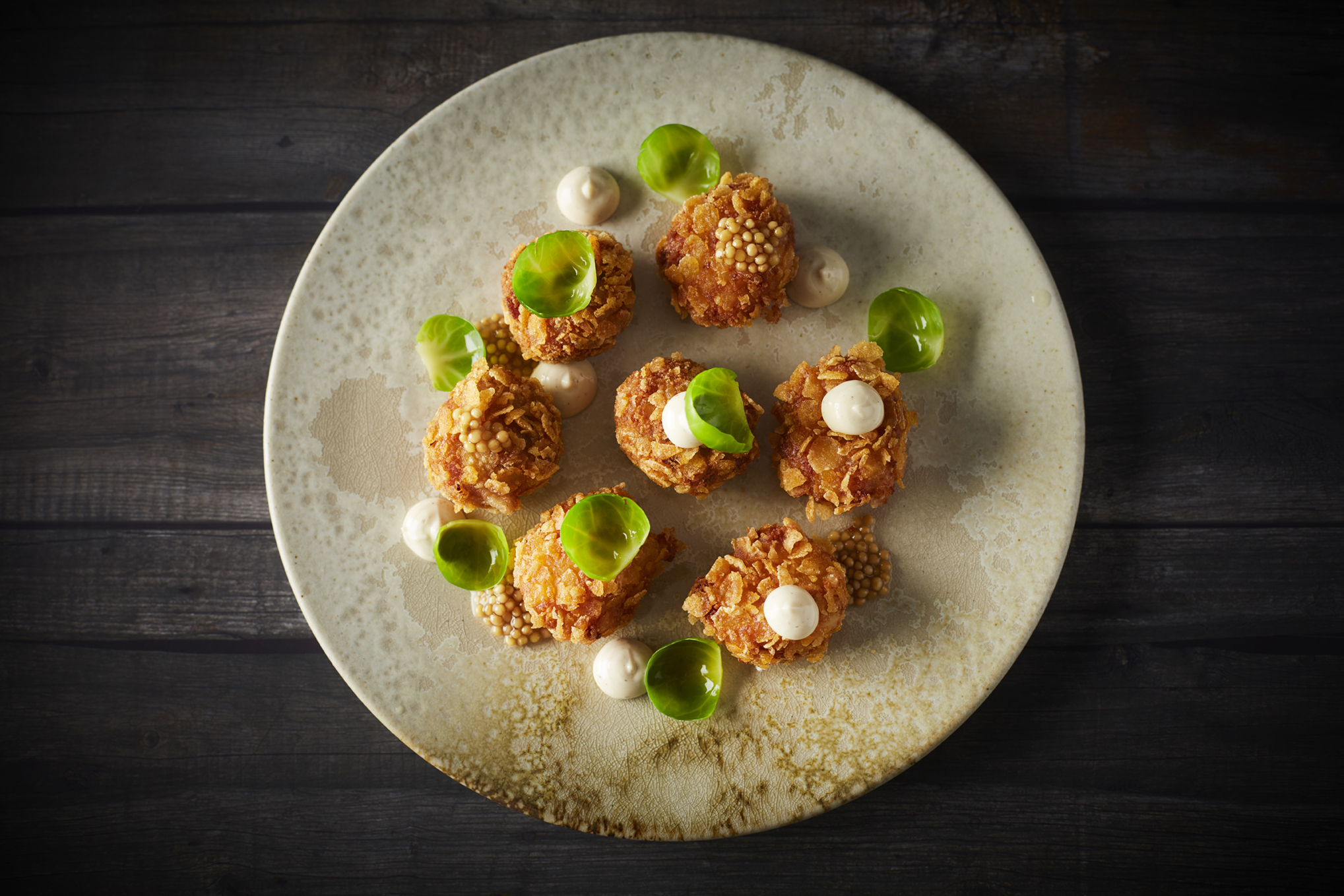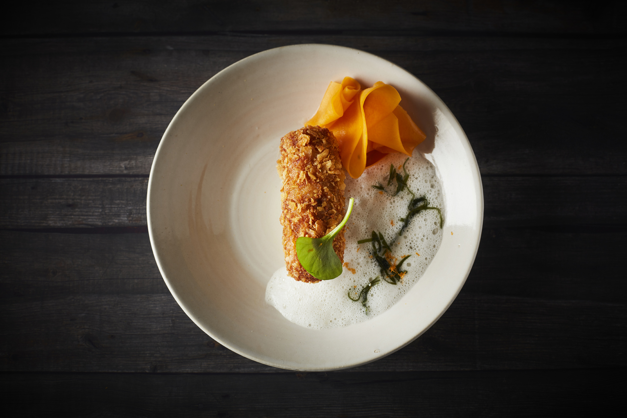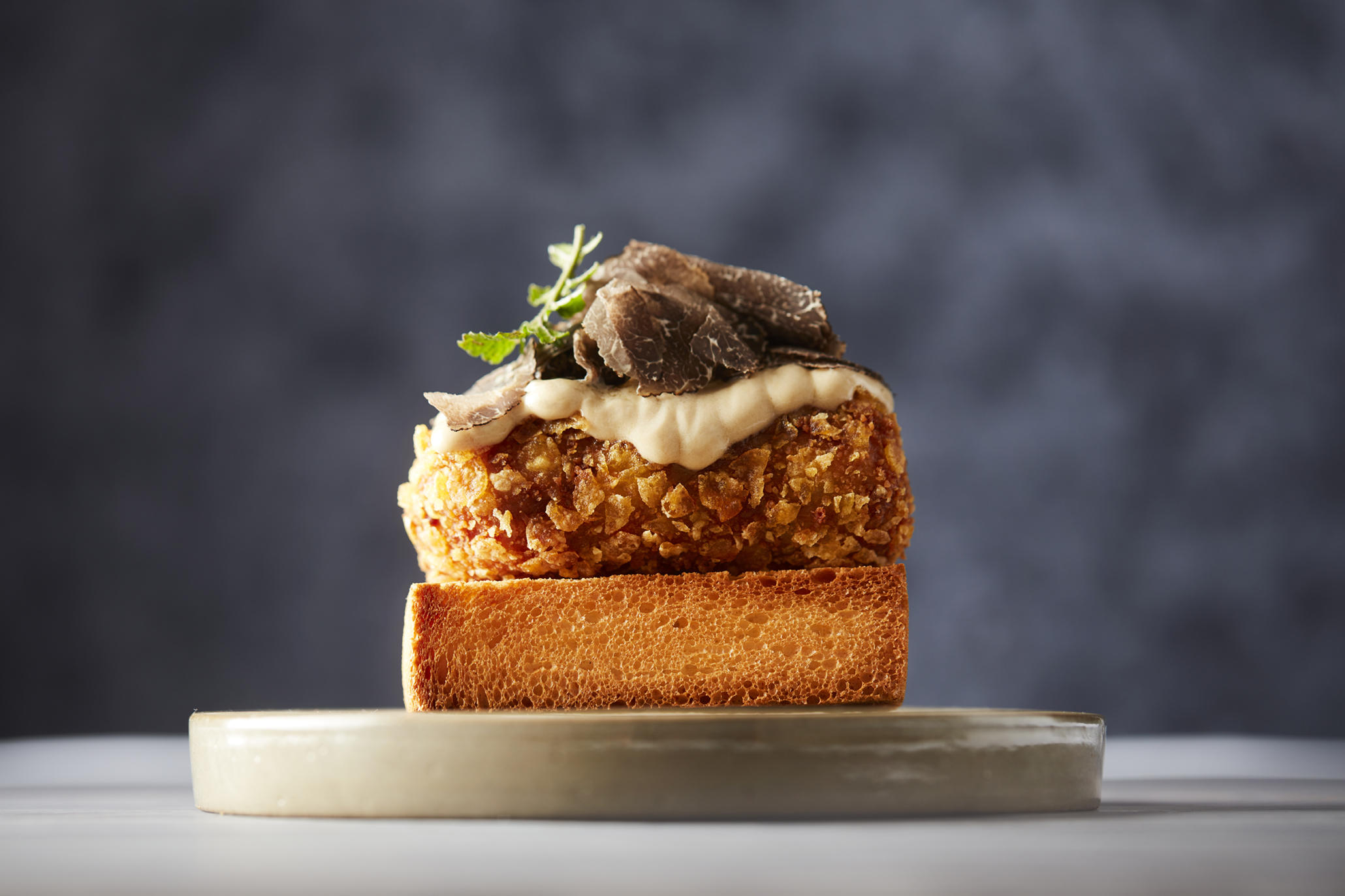 blend croquette original, means a croquette made of the unused parts of the Duroc pig. The Duroc pig is a wild, orange-haired pig, which is known for its tender and moisty meat, full of flavour. The tongue, cheek and knee are cooked in a lovage stock and finished with Italian fennel pollen.